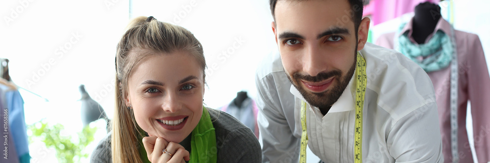 Fotografie Smiling designer stylist discusses tailoring of new clothes with client and holds clipboard