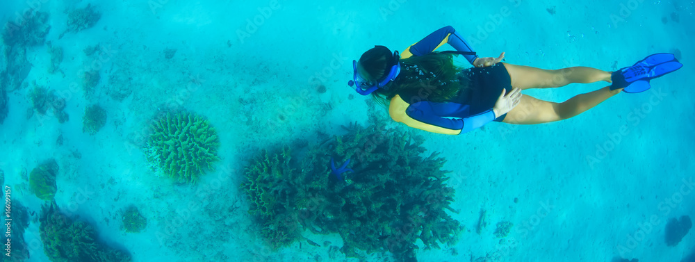 Obraz na plátně Snorkeller swimming underwater above reef
