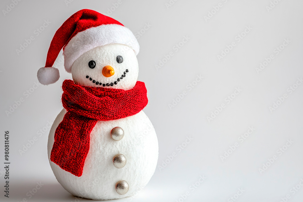 Fotografie snowman with red scarf and Santa hat on isolated white background