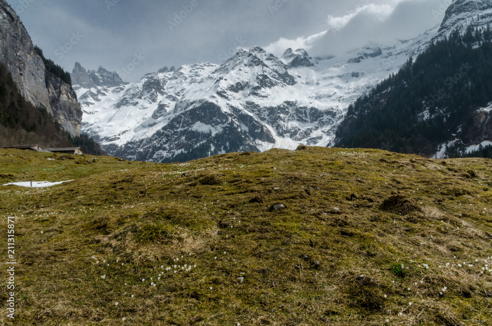 Fotografie Snowy rocky mountains in full sun