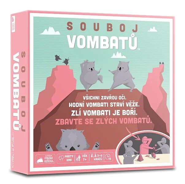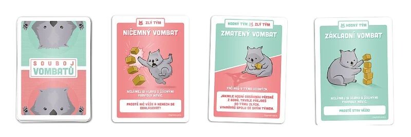 Přichází totální vombatí souboj! Buďte součástí vombatího týmu, kterému se v průběhu několika kol podaří jako prvnímu získat 3 body buď za stavění, nebo boření třech vombatích věží. Dejte však pozor, aby vás ostatní neodhlasovali ještě před koncem hry!