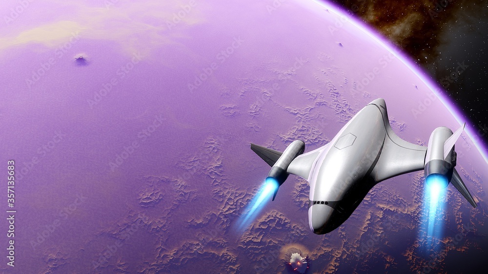 Fotografie spacecraft flies over a purple planet, space tourism, tourist spacecraft, commer