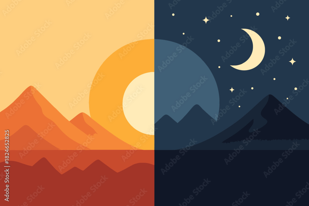 Fotografie Split image showing day and night with mountains and celestial bodies