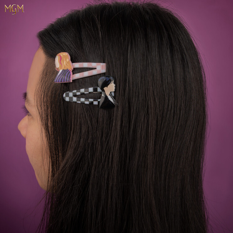 Sada 4 spon do vlasů inspirovaných seriálem Wednesday: dvě spony s mašlí a dvě pukačky - stylový doplněk, který spojí temnou eleganci Wednesday s pastelovou energií Enid. Rozměry: spona s mašlí 10 × 5 × 2.5 cm; pukačka 6 × 3 × 0.7 cm.