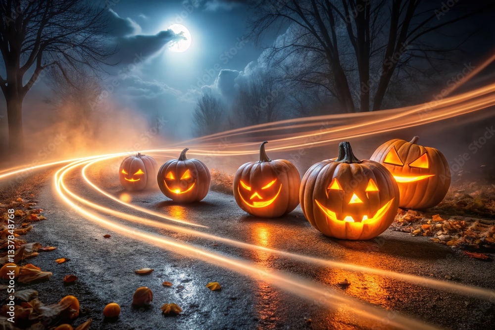 Fotografie Spooky Halloween Night: Long Exposure Light Trails and Jack-o'-lanterns