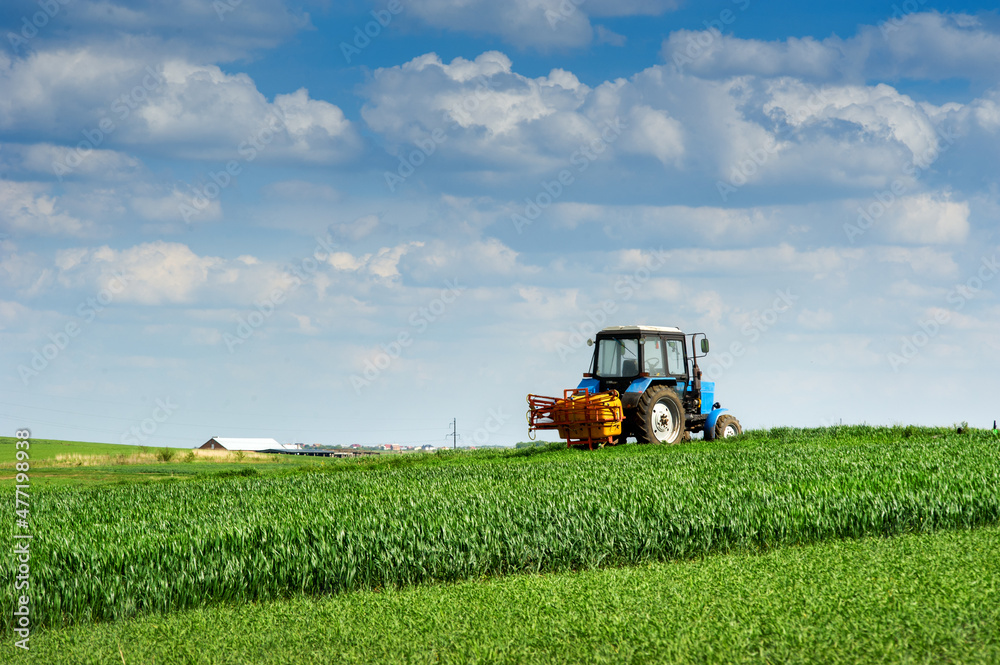 Fotografie sprayer in a wheat field in the spring, the hills of agricultural land