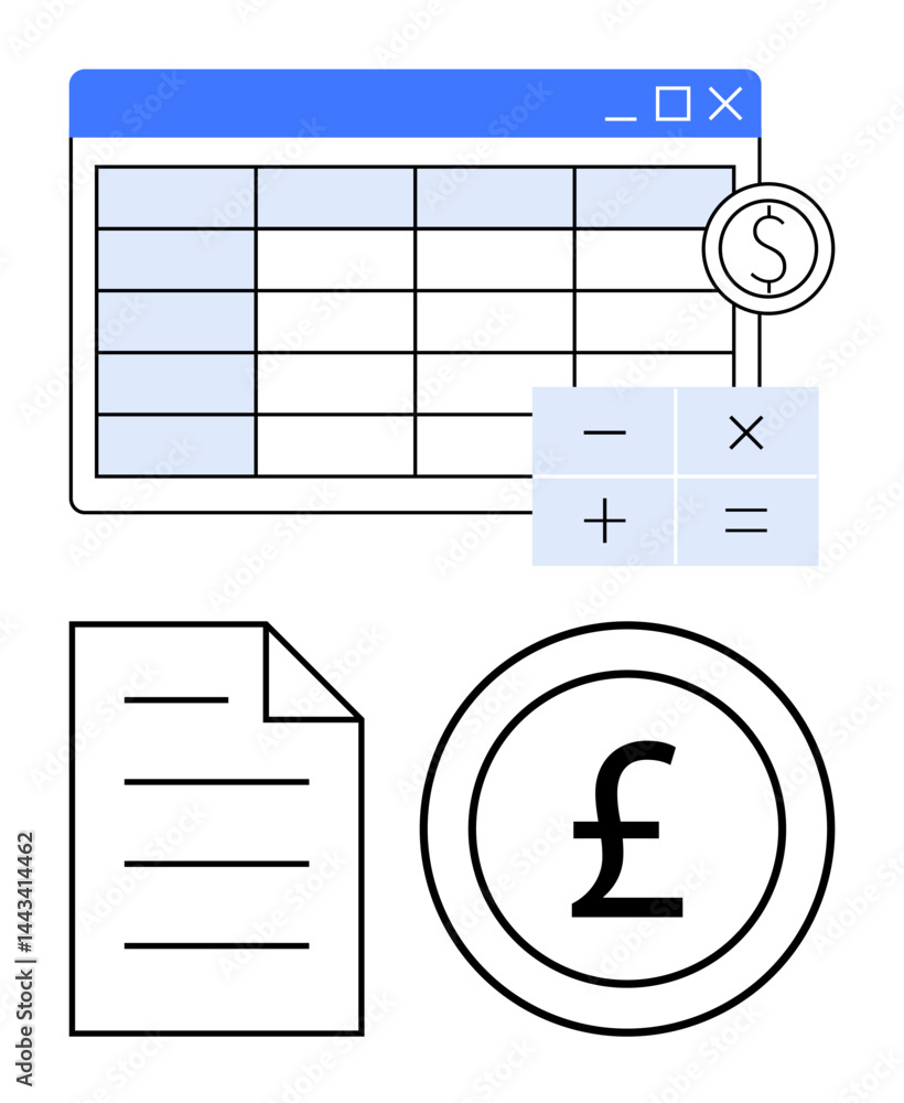 Fotografie Spreadsheet window paired with calculator buttons, paper document, and pound currency icon