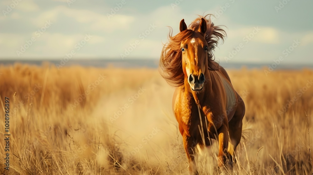 Fotografie Startled horse in a grassy field galloping with dynamic motion and detailed mane