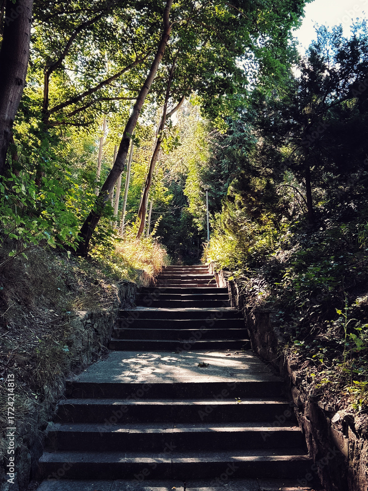 Fotografie Stone staircase leading uphill through a forest path surrounded by tall green tr