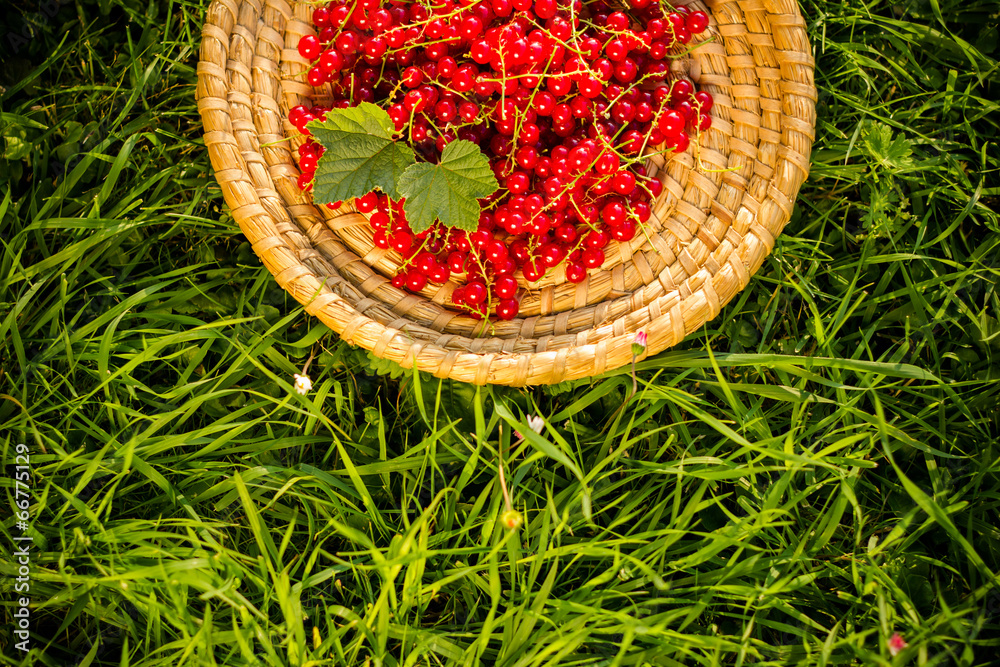 Obraz na plátně Straw scuttle full of fresh organic red currants crop
