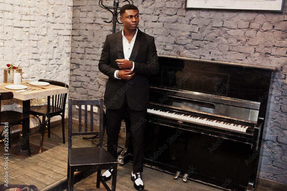 Obraz na plátně Strong powerful african american man in black suit standing against piano