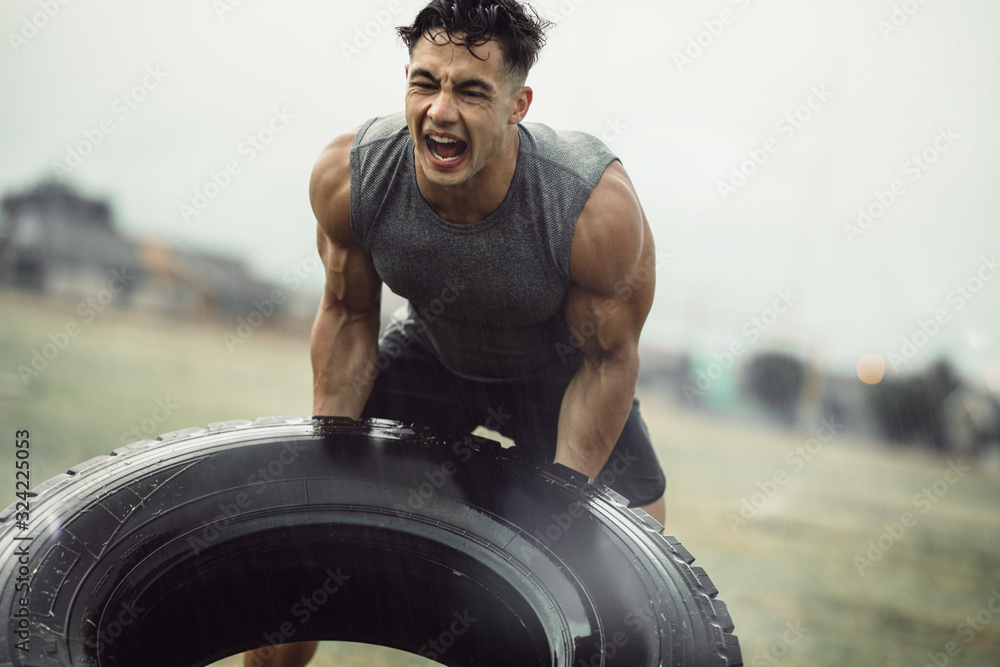 Obraz na plátně Strong sportsman doing a tire flip exercise