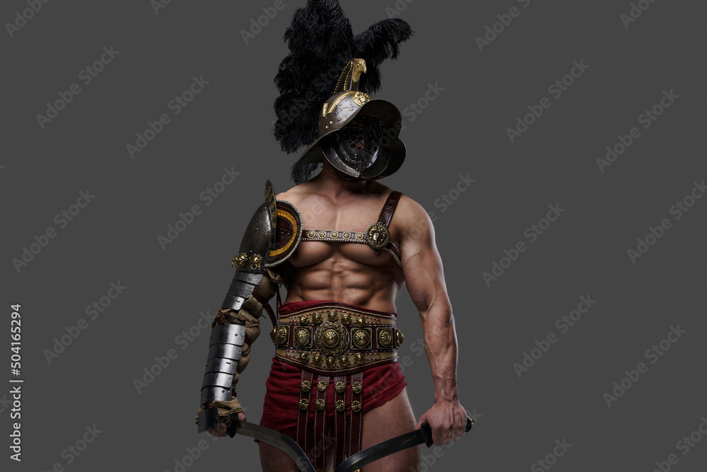 Obraz na plátně Studio shot of antique gladiator with muscular build and two swords isolated on gray background
