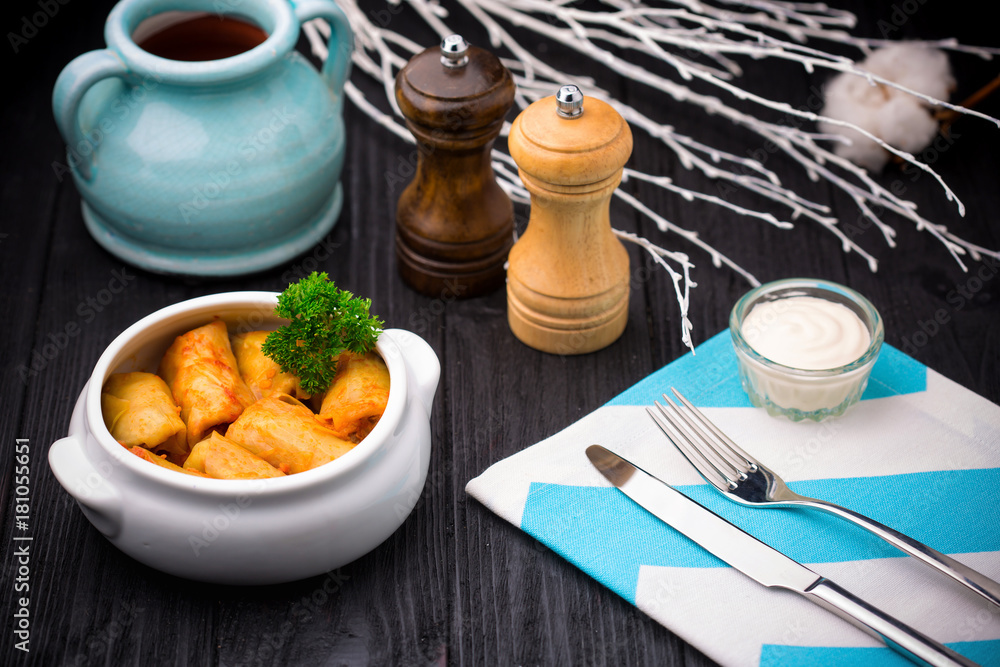Fotografie Stuffed cabbage leaves with minced meat and rice in tomato sauce