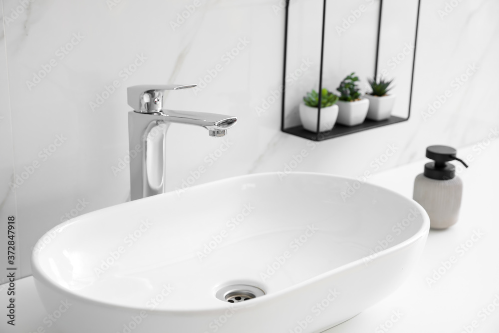 Fotografie Stylish vessel sink on bathroom counter. Interior design