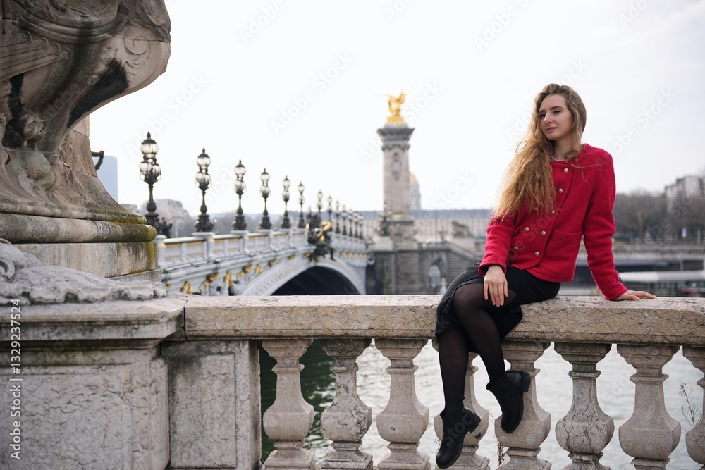 Fotografie Stylish woman in red coat sitting on Parisian bridge railing