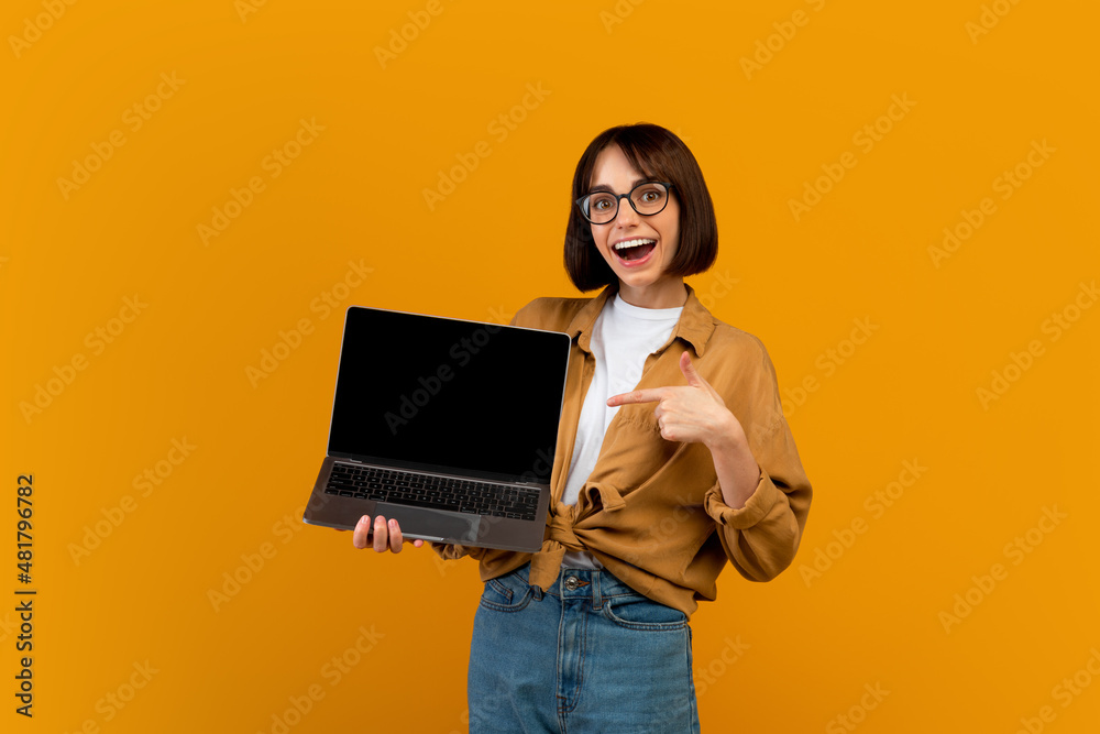 Fotografie Surprised young woman pointing at laptop with empty screen, standing over yellow background
