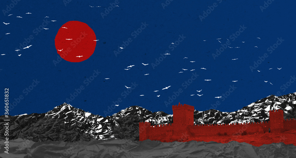 Fotografie Surreal collage composition made of torn pieces of vintage paper, craft, foil