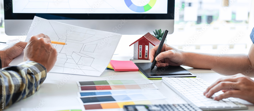 Obraz na plátně Team design of young Interior graphic designer working house project sketching o