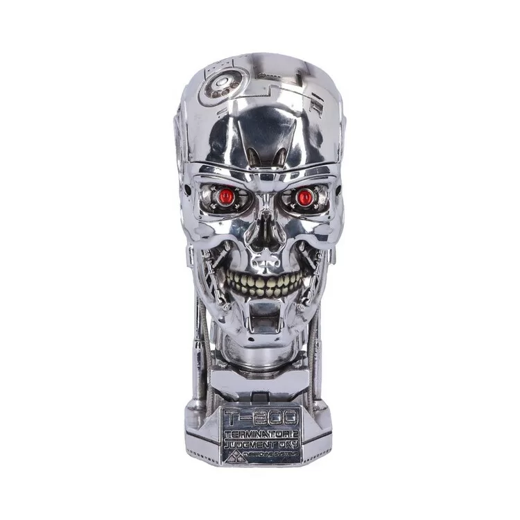 Poslán zpět v čase z budoucnosti, tento oficiálně licencovaný box byl vytvořen alternativní značkou Nemesis Now. S červeně svítícími očima, které hledí přímo před sebe, tento bust T-800 Terminátora zbavený lidské kůže odhaluje hydrauliku pokrytou kovovou kostrou, která zesměšňuje lidstvo. Červeně svítící oči hledí vpřed hrozivě. Vrchol lebky lze odklopit, aby se odhalil překvapivě prostorný úložný prostor. Metalická základna nese na přední straně desku, která identifikuje bustu jako T-800 z Terminátora 2: Soudný den, s logem Cyberdyne Systems pod ní. Odlit z nejkvalitnější pryskyřice a pečlivě ručně malovaný, je tento box ideální způsob, jak uchovat cenné suvenýry v bezpečí před hrozbou androidů.