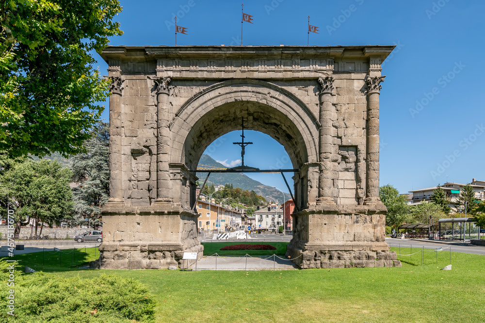 Fotografie The ancient Arch of Augustus in the historic center of Aosta, Italy, on a sunny