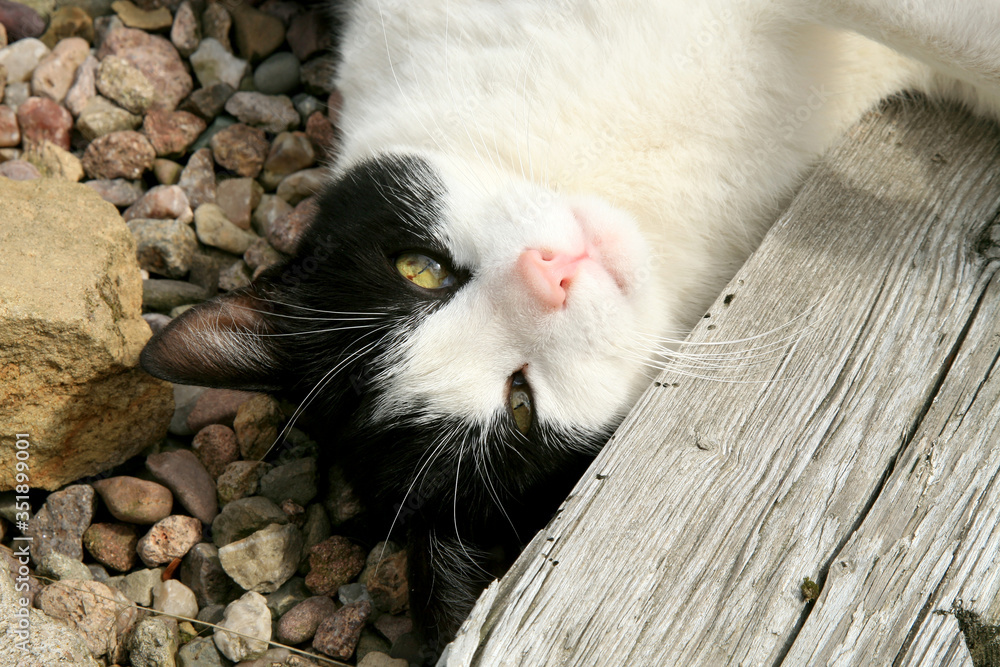 Obraz na plátně The black and white tomcat lounging on the terrace on a warm, sunny day
