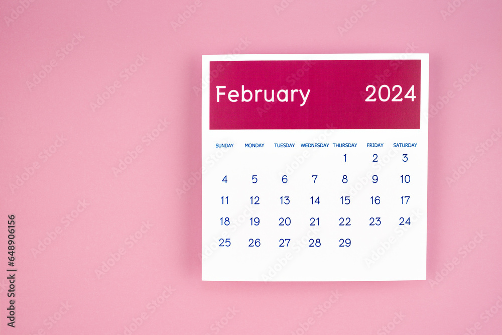 Obraz na plátně The calendar page february 2024 on pink color background.