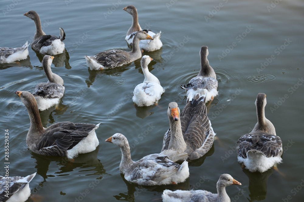 Fotografie The herd of geese bathe in the river