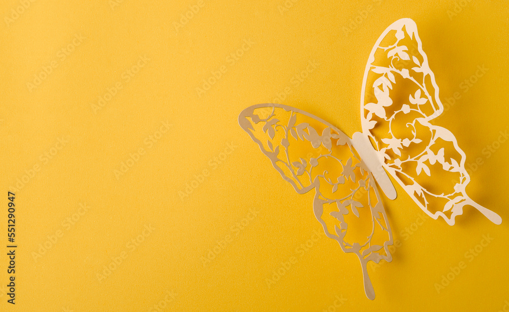 Fotografie The Paper butterflies on a orange paper background with empty space
