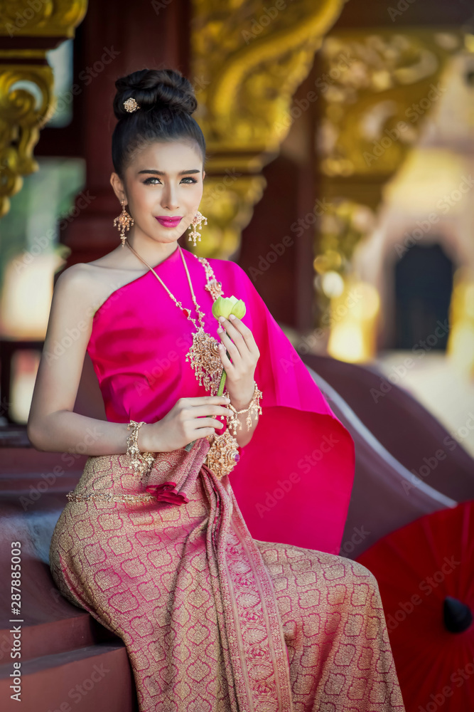 Fotografie The woman wears a Thai dress, folds the lotus flower