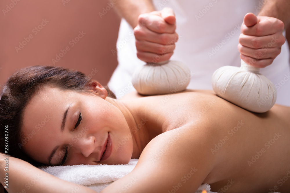 Obraz na plátně Therapist Giving Massage With Herbal Compress Balls To Woman