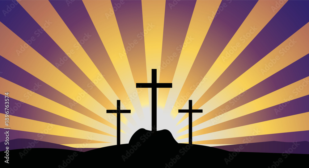Fotografie Three easter crosses silhouetted against a dramatic sunburst background, symboli