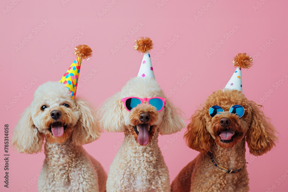 Fotografie Three happy cute poodle dogs with sunglasses and birthday hat against pink background