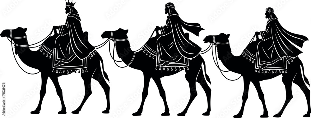 Fotografie Three Wise Men Riding Camels Silhouette Vector, Biblical Magi Journey, Christmas