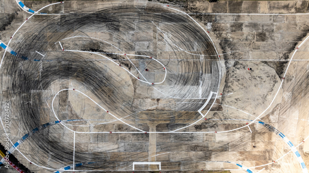 Obraz na plátně Tire track mark on asphalt tarmac road race track texture and background, Abstract background black tire tracks skid on asphalt road in racing circuit, Tire mark skid mark on asphalt road