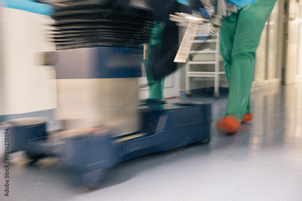 Fotografie Surgeon Walking in Hospital Corridor, the legs of surgeon in green scrubs and co