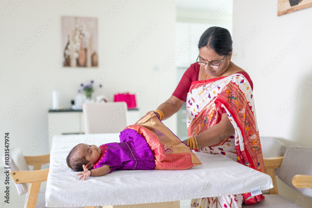 Fotografie ndian family spending time together, wearing traditional and casual outfits with a baby, a young girl, and grandparents in a high-rise apartment in Kuala Lumpur, Malaysia