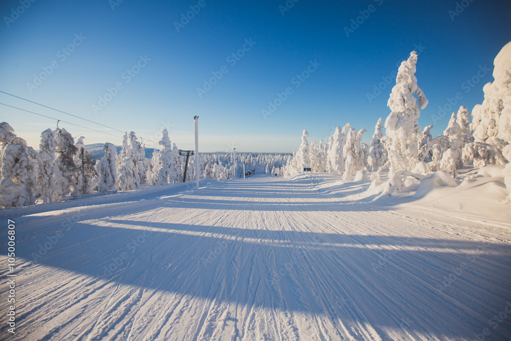 Fotografie Beautiful cold mountain view of ski resort, sunny winter day with slope, piste a