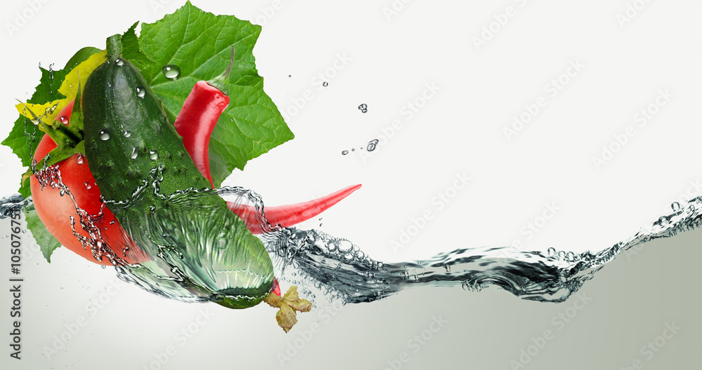 Fotografie Cucumber, tomato and pepper in a spray of water.