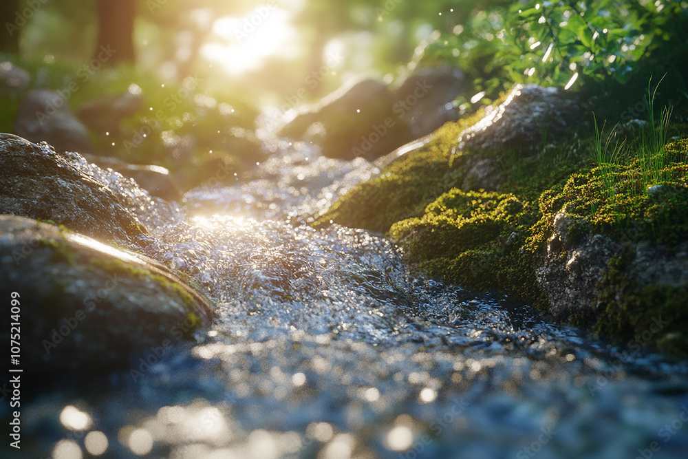 Fotografie Close-up of flowing water in the rocks, with sunlight, mossy stones