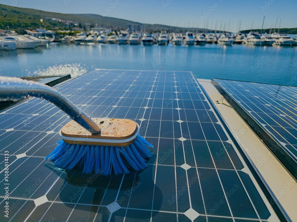 Fotografie Photography of solar panels on a boat docked at the port being cleaned up with a blue brush and water to collect solar energy more efficiently during a sunny day