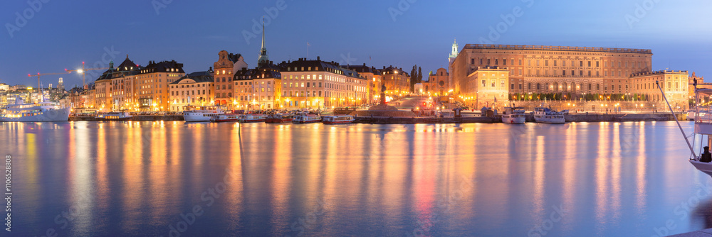 Fotografie Panoramic view of the old town city waterfront at sunset, Stockholm, Sweden