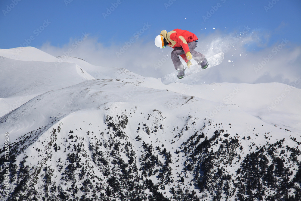 Snowboard rider jumping on mountains. Extreme snowboard freeride sport.