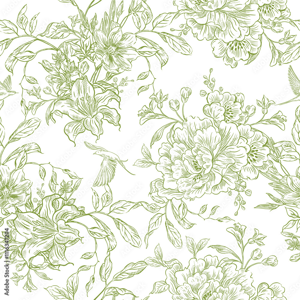 Fotografie Graphic seamless pattern with flowers and birds. Illustration