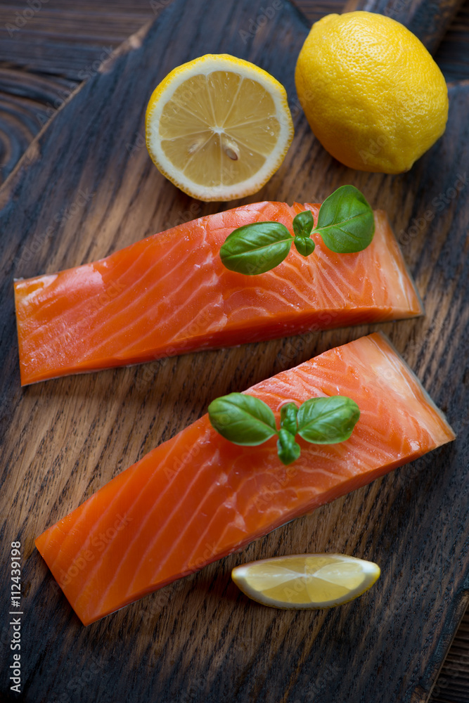 Fotografie Close-up z uzeného pstruha filé s citronem a bazalkou, nad pohled