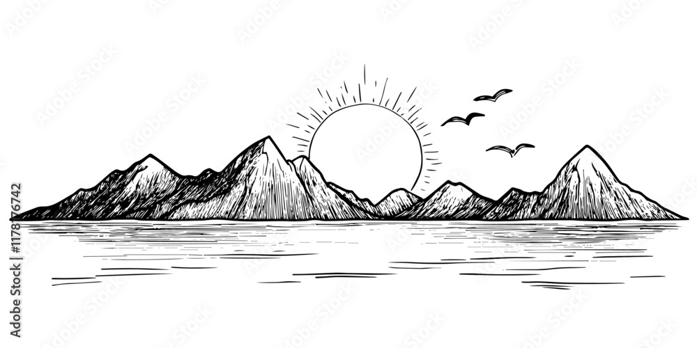 Fotografie mountain range with sunrise and birds over water, hand drawn sketch