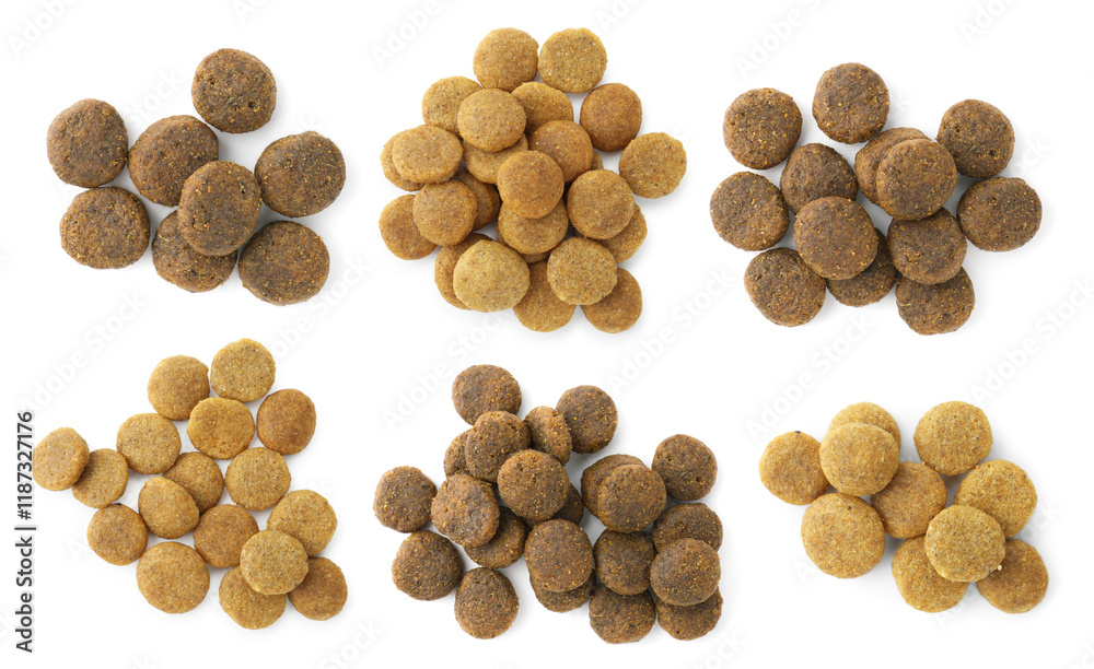 Fotografie Dry pet food for dogs isolated on white, top view