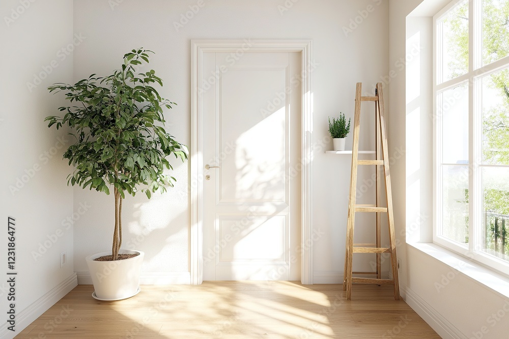 Fotografie Bright and airy interior with a potted plant and ladder near a sunny window