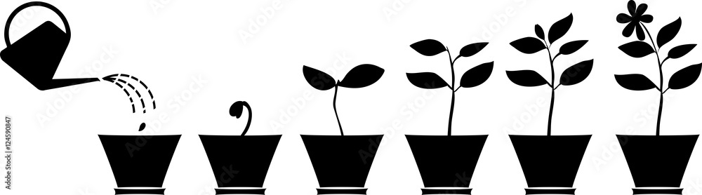 Fotografie Scheme of flower growth. Silhouettes of plants in the flowerpot