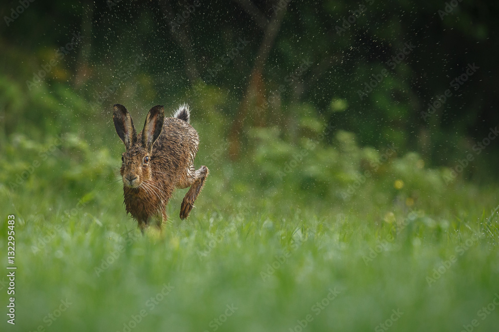 Fotografie hare is running in the beautiful light on green grassland,european wildlife, wil